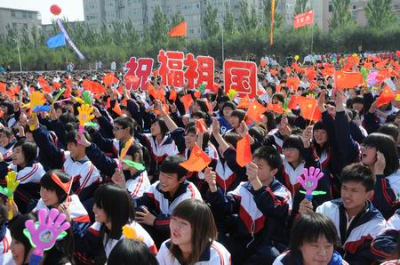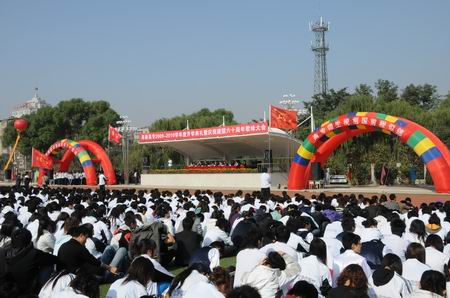 金秋時(shí)節(jié),碩果累累。在這收獲的季節(jié)里,祖國母親迎來了她六十歲華誕。走過半個(gè)世紀(jì)風(fēng)風(fēng)雨雨的阜新高專,又迎來了來自祖國各地的1500多名莘莘學(xué)子。9月29日上午,阜新高專校園內(nèi)彩旗飛舞、彩球飄揚(yáng),學(xué)校新建成的帆型主席臺(tái)上花團(tuán)錦簇,兩側(cè)矗立的巨型彩虹門上赫然寫著“舉國歡慶祖國母親六十華誕,高專師生祝祖國前程似錦”的字樣,更增添了校園的節(jié)日氣氛。全校5000余名師生齊聚新鋪設(shè)的塑膠運(yùn)動(dòng)場,隆重舉行2009—2010學(xué)年度開學(xué)典禮暨慶祝中華人民共和國成立六十周年歌詠大會(huì),共同迎接祖國母親60華誕的到來。