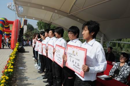 雄壯的國歌聲拉開了典禮的序幕。工程系王健老師、計(jì)信系李博鈺同學(xué)和文法系喬依娜同學(xué)分別代表教師、老生和新生在典禮上發(fā)言。大會(huì)表彰了上一學(xué)年度文明班級(jí)、三好學(xué)生、優(yōu)秀學(xué)生干部和優(yōu)秀團(tuán)員。