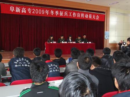為響應(yīng)國家號召,鼓勵我校大學(xué)生積極應(yīng)征入伍服役,推進國防和軍隊現(xiàn)代化建設(shè),10月26日下午,我校在報告廳隆重召開阜新高專2009年冬季征兵工作宣傳動員大會。副校長李彥平和海州區(qū)武裝部領(lǐng)導(dǎo)參加了動員會。大會由校就業(yè)指導(dǎo)服務(wù)中心主任寶艷紅主持。