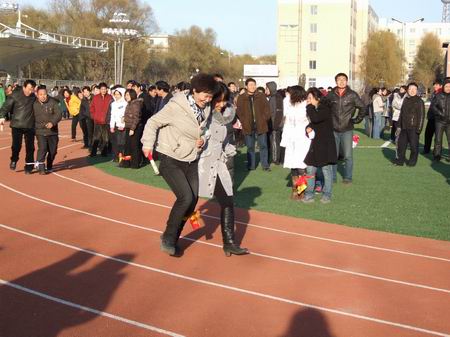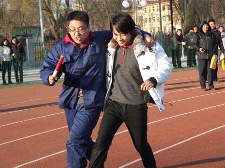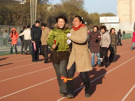 比賽開始了,場上的局面是既緊張,又熱鬧。有的選手因為配合默契健步如飛,兩人如同一人;有的選手因缺少默契而影響了速度,遠遠地落在了后面;有的選手因為心急而將接力棒掉到了地上;最有趣的是有的選手因步調(diào)不一致而導(dǎo)致兩人雙雙摔倒在跑道上,惹得場外觀眾笑得前仰后合。此時這場趣味比賽已經(jīng)成了教工們放松身心,溝通情感的休閑活動。