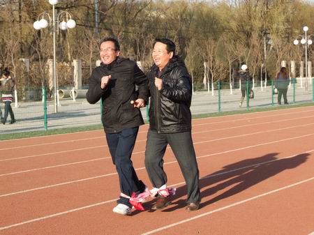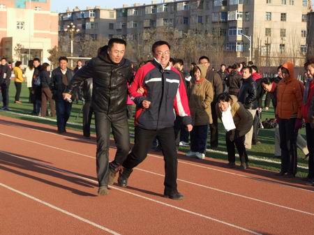 “兩人三足”活動是個深受百姓喜愛的趣味體育項目,顧名思義是指兩名運動員各有一只腳綁在一起,兩人運用三只腳跑步。雖然比賽對選手身體素質(zhì)和技巧有一定的要求,但其更具魅力和趣味的還是對兩名選手配合、協(xié)調(diào)性的特殊要求。教工們對這次活動非常感興趣,積極性很高,不少同志早早來到場地練習(xí)。