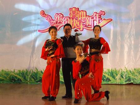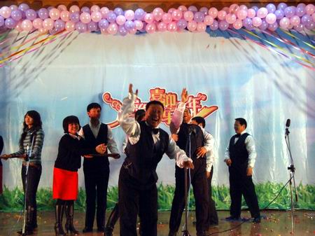 演出接近尾聲時(shí),由校領(lǐng)導(dǎo)參演的小合唱《今夜無眠》閃亮登場(chǎng)。趙瑞江校長、王占清副書記、李彥平副校長與機(jī)關(guān)綜合部門的七位同志一同神采飛揚(yáng)地走上舞臺(tái)。別具一格的出場(chǎng)形式讓觀眾耳目一新,歡快的旋律、優(yōu)美的和聲博得了全場(chǎng)觀眾的陣陣吶喊歡呼。尤其是趙校長和李校長伴隨間奏曲跳的幾步華爾茲更是引起全校教工的驚呼。在“禮花漫天”的歌詞中,校領(lǐng)導(dǎo)把一捧捧甜美的糖果撒向全體教職工。