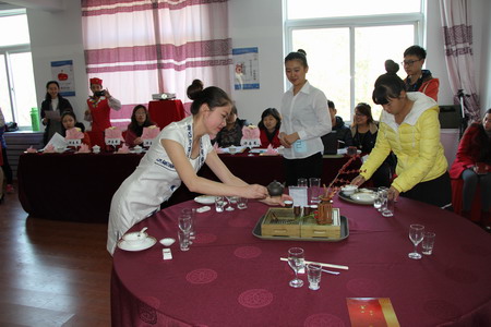 在悠揚(yáng)的音樂聲中,中餐擺臺(tái)技能大賽正式開始。本次大賽共分為擺臺(tái)、介紹宴會(huì)主題、基礎(chǔ)知識(shí)和英語(yǔ)口語(yǔ)等項(xiàng)目。每一位選手的擺臺(tái)都風(fēng)范十足、擺臺(tái)整體造型也十分具有創(chuàng)意,充分展示他們良好的基礎(chǔ)知識(shí),標(biāo)準(zhǔn)流利的英語(yǔ)口語(yǔ)水平。置身賽場(chǎng)之中,真是稱得上是一種美的享受,讓觀眾和評(píng)委感受到了書墨之中的中國(guó)傳統(tǒng)的古風(fēng)韻味,中國(guó)茶藝的淡雅清新,中秋佳節(jié)的圓滿溫馨還有蒙族文化的異域風(fēng)情。讓在場(chǎng)所有的人都大開眼界,沒想到餐桌還有如此高雅,如此深廣的藝術(shù)美。