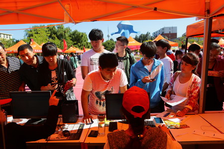 12日早6點(diǎn),彩虹門上“阜新高專熱烈歡迎2015級(jí)新同學(xué)”的大紅橫幅高高矗立在校門口,色彩斑斕的迎新彩球與條幅把高專校園裝扮得喜慶祥和。6點(diǎn)半,校門口、休閑廣場(chǎng)、寢室樓等各迎新接待站及門口的禮儀全員到齊,“嚴(yán)陣以待”喜迎新生。各職能部門負(fù)責(zé)人、各系部領(lǐng)導(dǎo)等親臨迎新現(xiàn)場(chǎng),校學(xué)生會(huì)、系學(xué)生會(huì)200余人組成了迎新志愿者與各系部輔導(dǎo)員一道,為新生進(jìn)行全方位服務(wù)。當(dāng)新生在校門口的迎新接待站咨詢完畢后,志愿者負(fù)責(zé)帶領(lǐng)他們來到廣場(chǎng)的各自系部進(jìn)行報(bào)道,之后各系部的志愿者陪同新生辦理入學(xué)手續(xù),直至全部辦好。師范部的彩噴、計(jì)信系的cosplay社團(tuán)、人文系的簽字版、綜職部的輪滑社團(tuán)等,成為迎新現(xiàn)場(chǎng)的一大亮點(diǎn)。學(xué)生處設(shè)立的“綠色通道”,為每一位貧困學(xué)生打開了求學(xué)的通道。