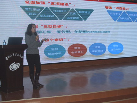 講座上,黨委副書記呂東春對十八屆五中全會提出的“全面小康”、“經(jīng)濟速度”、“創(chuàng)新發(fā)展”、“協(xié)調(diào)發(fā)展”、“綠色發(fā)展”、“開放發(fā)展”、“共享發(fā)展”、“二孩政策”、“加強黨建”、“反腐斗爭”十大關(guān)鍵詞進行逐一解讀。在解讀關(guān)鍵詞“全面小康”時,呂書記從兩個一百年、兩個翻一番、“四個全面”、五個加快等方面讓學(xué)生全面了解了小康社會的含義;到2020年實現(xiàn)GDP比2010年翻一番,“十三五”時期,我國年均經(jīng)濟增速需要達到6.5%,呂書記用精準的數(shù)字闡述了中國近幾年的“經(jīng)濟速度”;自2013年以來,國家出臺了一系列推動自主創(chuàng)新、創(chuàng)業(yè)的政策,全民參與創(chuàng)新、創(chuàng)業(yè)的意愿空前高漲,“創(chuàng)新發(fā)展”進入到嶄新階段;過去發(fā)展的不協(xié)調(diào)造成了區(qū)域、城鄉(xiāng)和群體之間的差距,未來重點促進城鄉(xiāng)區(qū)域、經(jīng)濟社會的“協(xié)調(diào)發(fā)展”,在增強國家硬實力的同時注重提升國家軟實力;生態(tài)文明建設(shè)是我國現(xiàn)代化建設(shè)中相對薄弱的領(lǐng)域,堅持“綠色發(fā)展”是經(jīng)濟新常態(tài)下的必然選擇;新形勢下,中國需要更開放的視野,“一帶一路”倡議是順應(yīng)世界經(jīng)濟發(fā)展新趨勢作出的重大決策,借助對外開放平臺,促進“開放發(fā)展”;“共享發(fā)展”激發(fā)了社會各界人人參與、人人盡力、人人享有的能動性;從上世紀70年代我國開始全面推行計劃生育,致使1999年國家便過早進入老齡化,“二孩政策”是在新的經(jīng)濟社會發(fā)展節(jié)點的政策新選擇,對當(dāng)前人口形勢并不會產(chǎn)生太大的沖擊;在講到關(guān)鍵詞“加強黨建”中,呂書記從兩個堅持、兩個課題、四個考驗、四個危險和五項建設(shè)等方面講述了實施加強黨建的具體方案;打鐵還需自身硬,在未來5年,“反腐斗爭”將是黨的重要任務(wù)。在講座尾聲之際,呂書記用亞投行的建立、各國對亞投行的態(tài)度及“一帶一路”來敘述開放發(fā)展,從扶貧、收入、教育、就業(yè)、社會保障、醫(yī)療衛(wèi)生對共享發(fā)展給出了自己的分析和見解。