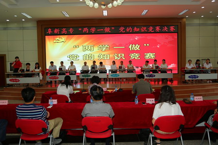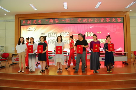 為深化“兩學(xué)一做”學(xué)習(xí)教育,推進(jìn)全面從嚴(yán)治黨向基層延伸,6月24日下午,我校在1號(hào)樓5樓報(bào)告廳舉辦了“兩學(xué)一做”黨的知識(shí)競(jìng)賽決賽。學(xué)校領(lǐng)導(dǎo)和全校400余名黨員到場(chǎng)觀看。特邀思政部主任徐元君、人文系黨支部書(shū)記陶曉穎教授、思政部張琪教授擔(dān)任評(píng)委。來(lái)自全校18個(gè)黨支部的黨員同志參加了本次競(jìng)賽。經(jīng)過(guò)預(yù)賽的激烈角逐,共有6支代表隊(duì)進(jìn)入決賽。