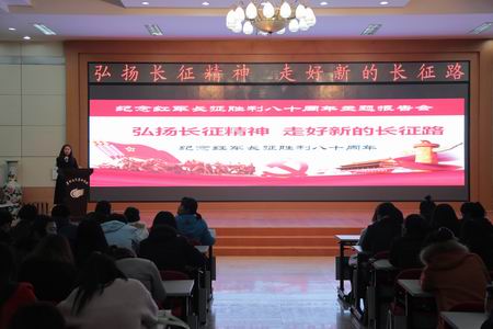 為紀(jì)念紅軍長(zhǎng)征勝利80周年,弘揚(yáng)偉大的長(zhǎng)征精神,10月24日晚6:30,由我校黨委副書記呂東春主講的“弘揚(yáng)長(zhǎng)征精神,走好新的長(zhǎng)征路”主題報(bào)告會(huì)在一號(hào)樓五樓報(bào)告廳舉行。我校400余名師生參加了此次報(bào)告會(huì)。報(bào)告會(huì)上,呂書記首先向師生們介紹了長(zhǎng)征形成的原因,然后通過(guò)對(duì)長(zhǎng)征途中幾大歷史事件的回顧,與大家重溫了那段可歌可泣的歷史。同時(shí),結(jié)合習(xí)近平總書記在紀(jì)念長(zhǎng)征勝利八十周年大會(huì)上的講話,呂書記重點(diǎn)闡述了長(zhǎng)征的歷史意義,謳歌了偉大的長(zhǎng)征精神,并號(hào)召同學(xué)們向先輩們學(xué)習(xí),走好新的長(zhǎng)征路。精美的課件,深情的講述,引起了師生們的強(qiáng)烈共鳴,無(wú)不為革命先烈為崇高理想勇敢戰(zhàn)斗,不怕犧牲,百折不撓的精神所感動(dòng)。為紀(jì)念紅軍長(zhǎng)征勝利80周年,激發(fā)了為實(shí)現(xiàn)偉大的中國(guó)夢(mèng)而努力奮斗的決心和熱情。