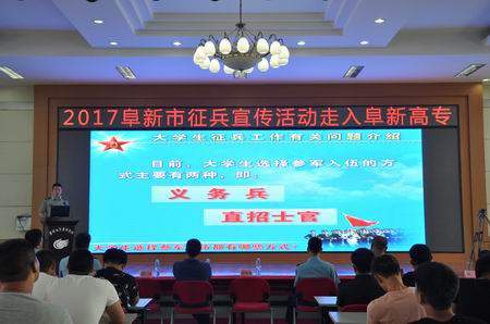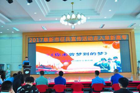 為深入貫徹遼寧省大學生征兵工作會議精神,幫助大學生了解和掌握應征入伍相關政策和流程,鼓勵學生積極應征入伍,獻身國防事業(yè),做好2017年大學生征兵宣傳教育工作, 6月21日下午2:30分,我校武裝部在一號教學樓五樓報告廳舉辦大型宣傳活動——2017年阜新市征兵宣傳活動走入阜新高專。參加本次活動的領導和嘉賓有:阜新軍分區(qū)參謀長楊景超,阜新高專副校長王立宏,阜新軍分區(qū)副團職參謀郭峰,市民政局退伍辦徐雪來,駐阜某飛行團教導員董兵,駐阜某飛行團排長孫飛,駐阜某飛行團中士秦孔毅,學校武裝部副部長寶艷紅、趙宏、佟欣。會議由武裝部副部長佟欣主持。