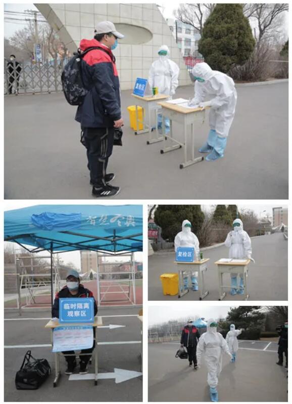 外省籍返校學(xué)生到達(dá),在校門外警戒線外間隔1米站排等候,學(xué)校保安人員組織有序入校報(bào)道。報(bào)到場(chǎng)地設(shè)有消毒區(qū)、測(cè)溫區(qū)、復(fù)檢區(qū)、臨時(shí)隔離區(qū)和各系報(bào)到區(qū),每個(gè)工作區(qū)間隔5米以上,臨時(shí)隔離區(qū)周圍5米禁止人員接近。學(xué)生依次經(jīng)過身份查驗(yàn)、消毒區(qū)、測(cè)溫區(qū)、報(bào)道登記處實(shí)施報(bào)到。