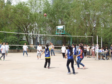 又訊:與男子籃球賽交相呼應(yīng)的是,在籃球場(chǎng)對(duì)面的排球場(chǎng)上,我校女子排球賽也正在如火如荼地進(jìn)行著。