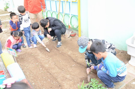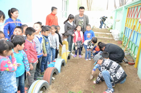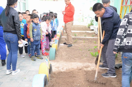 農(nóng)牧系志愿者們帶著勞動工具和我校在芬芳禾院溫室大棚育好的西紅柿、絲瓜、黃瓜等蔬菜苗,來到占地200多平米的蒙古族幼兒園小菜園,他們認真教小朋友們認識秧苗、農(nóng)具,使用小型鋤頭翻地,并手把手地教幼兒如何栽植小菜苗。孩子們在老師的帶領(lǐng)和志愿者們的幫助下,用稚嫩的小手拿起小鏟子、小水壺等種植工具一起興致勃勃地栽下菜苗,培土澆水,忙得不亦樂乎。