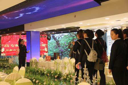 華美實(shí)業(yè)集團(tuán)總經(jīng)理郝冬寧率領(lǐng)酒店相關(guān)部門負(fù)責(zé)人熱情接待了我系師生。首先,銷售部經(jīng)理馬濤介紹了華美酒店的發(fā)展歷程、企業(yè)文化、酒店布局以及主要業(yè)務(wù)。之后,酒店各部門經(jīng)理帶領(lǐng)學(xué)生們參觀了酒店客房、宴會(huì)廳、花房、3D全息宴會(huì)廳、酒店廚房、酒店前臺(tái),并就客房的基本布置、婚宴的設(shè)計(jì)、前臺(tái)工作內(nèi)容以及相關(guān)設(shè)施設(shè)備的使用方法做了詳盡的介紹,使同學(xué)們對(duì)酒店環(huán)境和崗位要求都有了進(jìn)一步的了解。