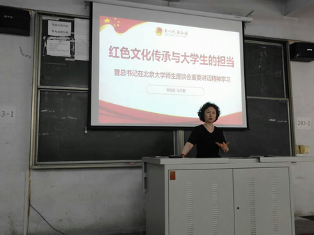 講座從紅色文化的內涵和價值入手,以五四運動和五四精神為切入點,并聯(lián)系總書記五四講話對青年人的期望,講到今天學習、傳承紅色文化的重要意義。最后,馬平野老師從“精神上不麻木”“文化上不忘本”“知識上不滿足”“行動上不妥協(xié)”四個角度告訴青年大學生應該如何樹立理想信念、如何學會學習、學會生活、學會擔當?;顒咏Y束時趙玲書記進行了總結,鼓勵同學們不忘初心,做一個勇于追夢的人。