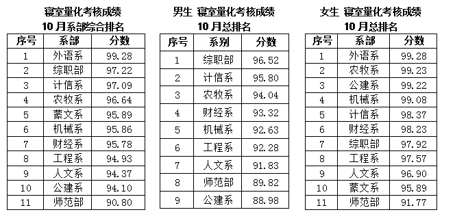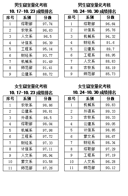 男生寢室量化考核10.10-10.16成績排名序號系別分數(shù)1農(nóng)牧系97.32計信系95.253綜職部95.174財經(jīng)系94.585工程系92.746師范部92.327機械系92.098人文系90.169公建系88.53女生寢室量化考核10.10-10.16成績排名序號系別分數(shù)1外語系1002公建系99.793農(nóng)牧系99.54機械系99.445計信系99.166財經(jīng)系99.027人文系98.478綜職部98.429師范部97.9310工程系97.811蒙文系95.42 | ![]() | |||
