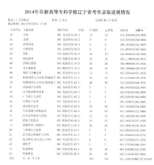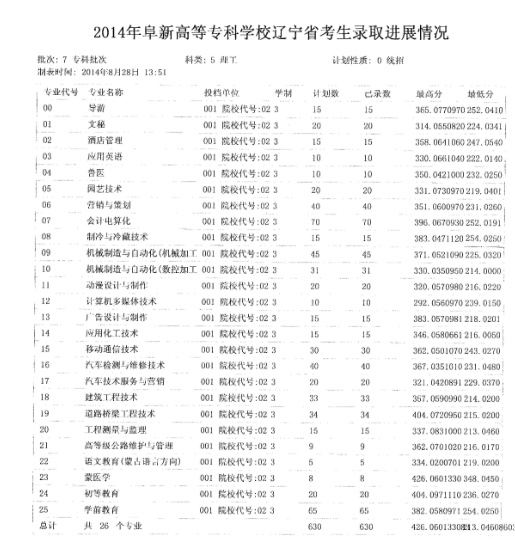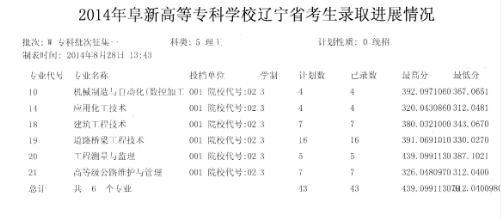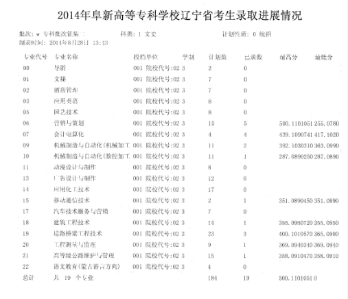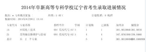 2014年阜新高等??茖W(xué)校遼寧省考生錄取進(jìn)展情況