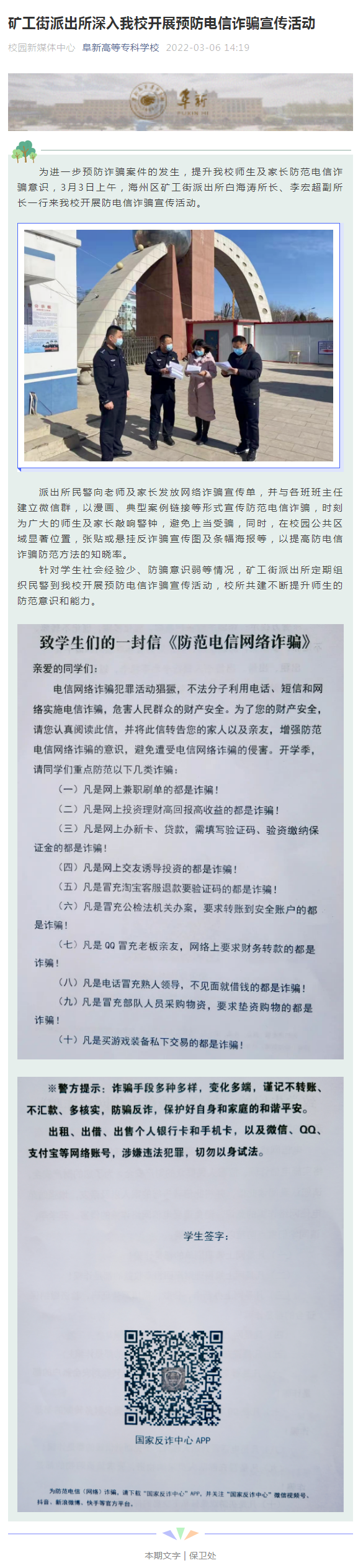 礦工街派出所深入我校開展預(yù)防電信詐騙宣傳活動