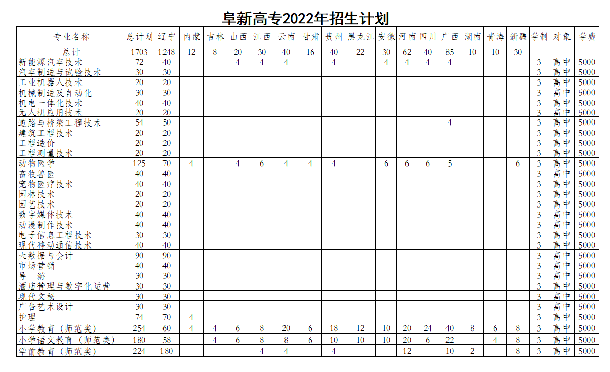 阜新高等專科學(xué)校2022年高中、三校生起點(diǎn)專科招生計(jì)劃