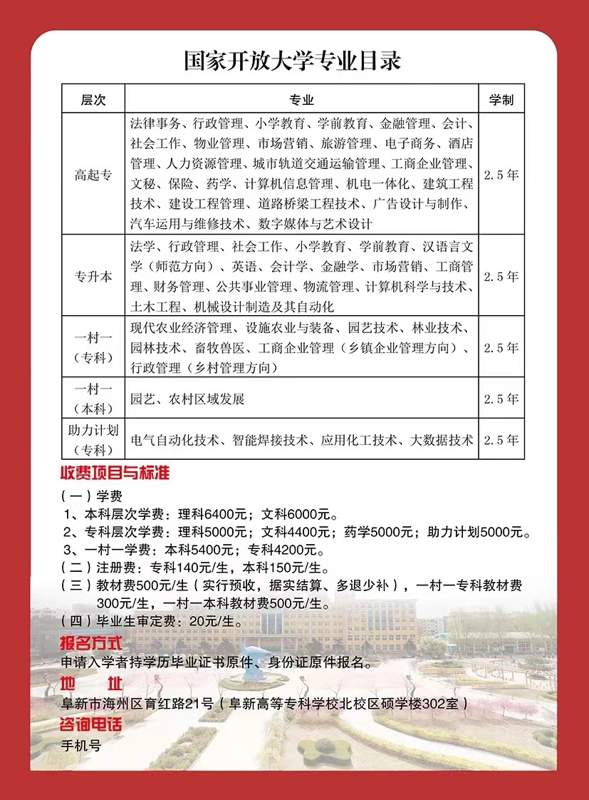 凡愿意參加開放教育學習的學員,均可持畢業(yè)證書原件(報考??粕究频膶W員,還須帶“中國高等教育學生信息網(wǎng)”下載的學歷認明復印件或“中國高等教育學歷認證中心”出具的認證報告原件)、畢業(yè)證和身份證復印件(復印在同一張B5紙上)、近期免冠一寸、二寸彩色(藍底、淺色上衣)照片各一張及有關費用到高專電大部招生辦公室(阜新市海州區(qū)育紅路21號 [原財校] 正門西樓 302室)辦理報名手續(xù)。