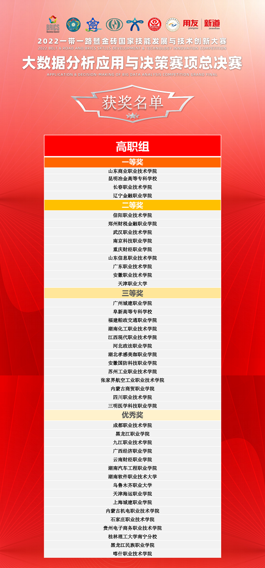 10月23日,2022一帶一路暨金磚國家技能發(fā)展與技術(shù)創(chuàng)新大賽“大數(shù)據(jù)分析應(yīng)用與決策”賽項(xiàng)總決賽圓滿結(jié)束,來自全國27個(gè)省市自治區(qū)的48支本科隊(duì)伍、42支高職隊(duì)伍參加了最后的角逐。經(jīng)過兩天的激烈鏖戰(zhàn),作為遼寧省派出的兩所高職院校之一的我校代表隊(duì)獲得了大賽三等獎(jiǎng)的優(yōu)異成績(jī)。