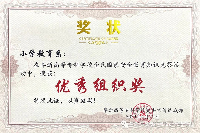 2023年4月10日至4月13日,根據(jù)阜新高等??茖W校2023年國家安全教育日主題系列活動安排,小學教育系組織學生參與阜新高等??茖W校全民國家安全教育知識競答活動,在本次競答活動中,我系共36名學生獲獎。其中一等獎5名,二等獎11名,三等獎20名。