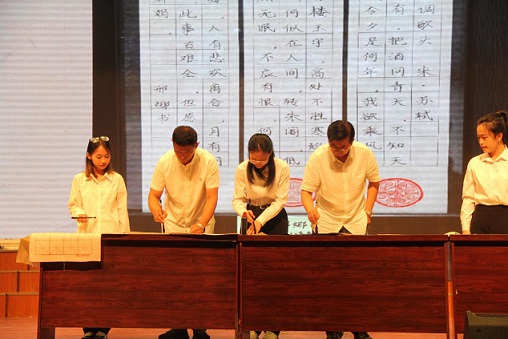 師生同臺(tái),共譜美育華章。崔運(yùn)宏、何曉東兩位老師與愛好書法的同學(xué)們?cè)谟茡P(yáng)的古箏伴奏下,在十米長(zhǎng)卷上揮筆寫下“以信立身,傳承古國(guó)遺風(fēng);