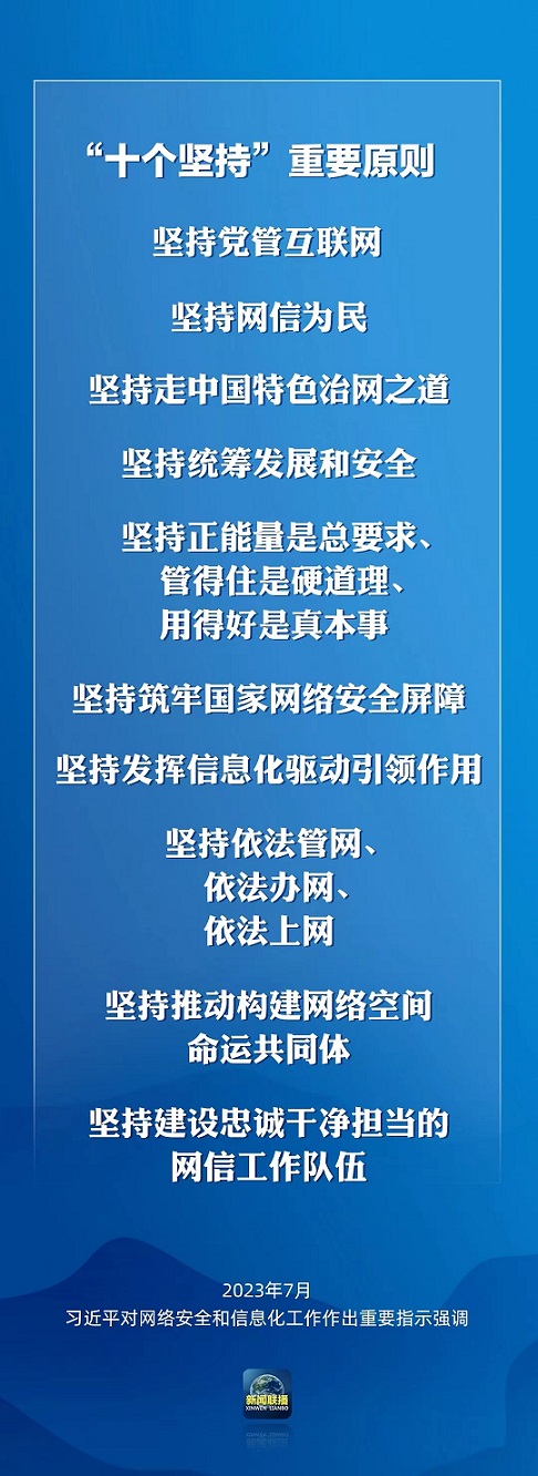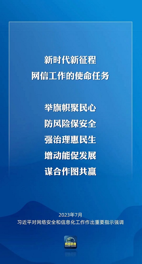 習近平強調(diào),新時代新征程,網(wǎng)信事業(yè)的重要地位作用日益凸顯。要以新時代中國特色社會主義思想為指導,全面貫徹落實黨的二十大精神,深入貫徹黨中央關于網(wǎng)絡強國的重要思想,切實肩負起舉旗幟聚民心、防風險保安全、強治理惠民生、增動能促發(fā)展、謀合作圖共贏的使命任務,堅持黨管互聯(lián)網(wǎng),堅持網(wǎng)信為民,堅持走中國特色治網(wǎng)之道,堅持統(tǒng)籌發(fā)展和安全,堅持正能量是總要求、管得住是硬道理、用得好是真本事,堅持筑牢國家網(wǎng)絡安全屏障,堅持發(fā)揮信息化驅(qū)動引領作用,堅持依法管網(wǎng)、依法辦網(wǎng)、依法上網(wǎng),堅持推動構(gòu)建網(wǎng)絡空間命運共同體,堅持建設忠誠干凈擔當?shù)木W(wǎng)信工作隊伍,大力推動網(wǎng)信事業(yè)高質(zhì)量發(fā)展,以網(wǎng)絡強國建設新成效為全面建設社會主義現(xiàn)代化國家、全面推進中華民族偉大復興作出新貢獻。
