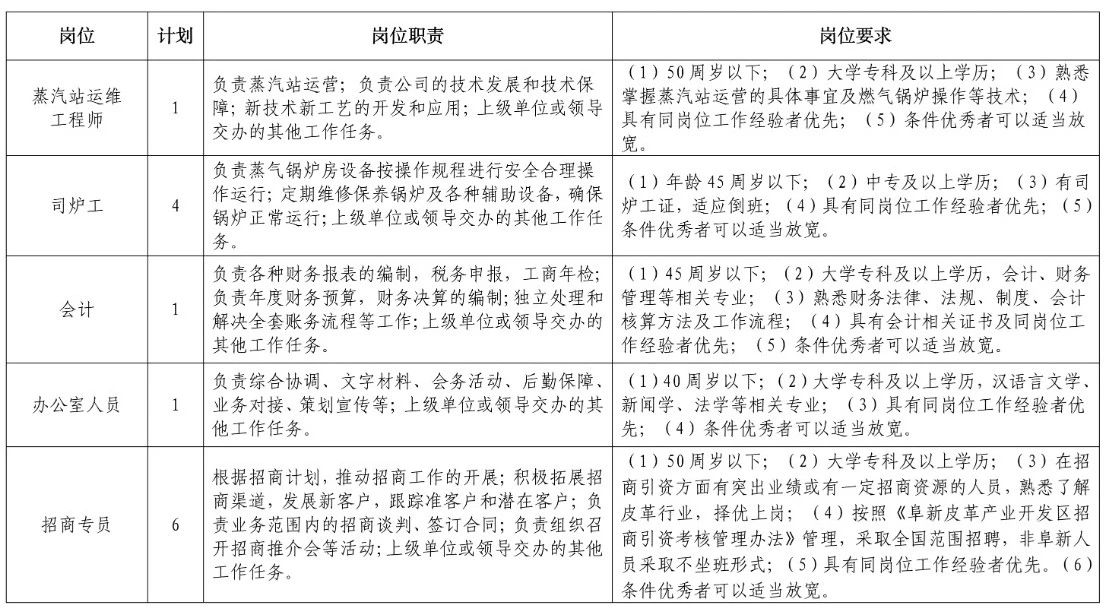 阜新清興皮革產(chǎn)業(yè)基地有限責任公司招聘工作人員需求表