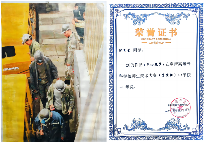 在近日落幕的阜新高專2024師生美術(shù)大賽中,23級造價一班張藝墨憑借其杰出的作品《匠心筑夢》一舉奪得學生組一等獎。