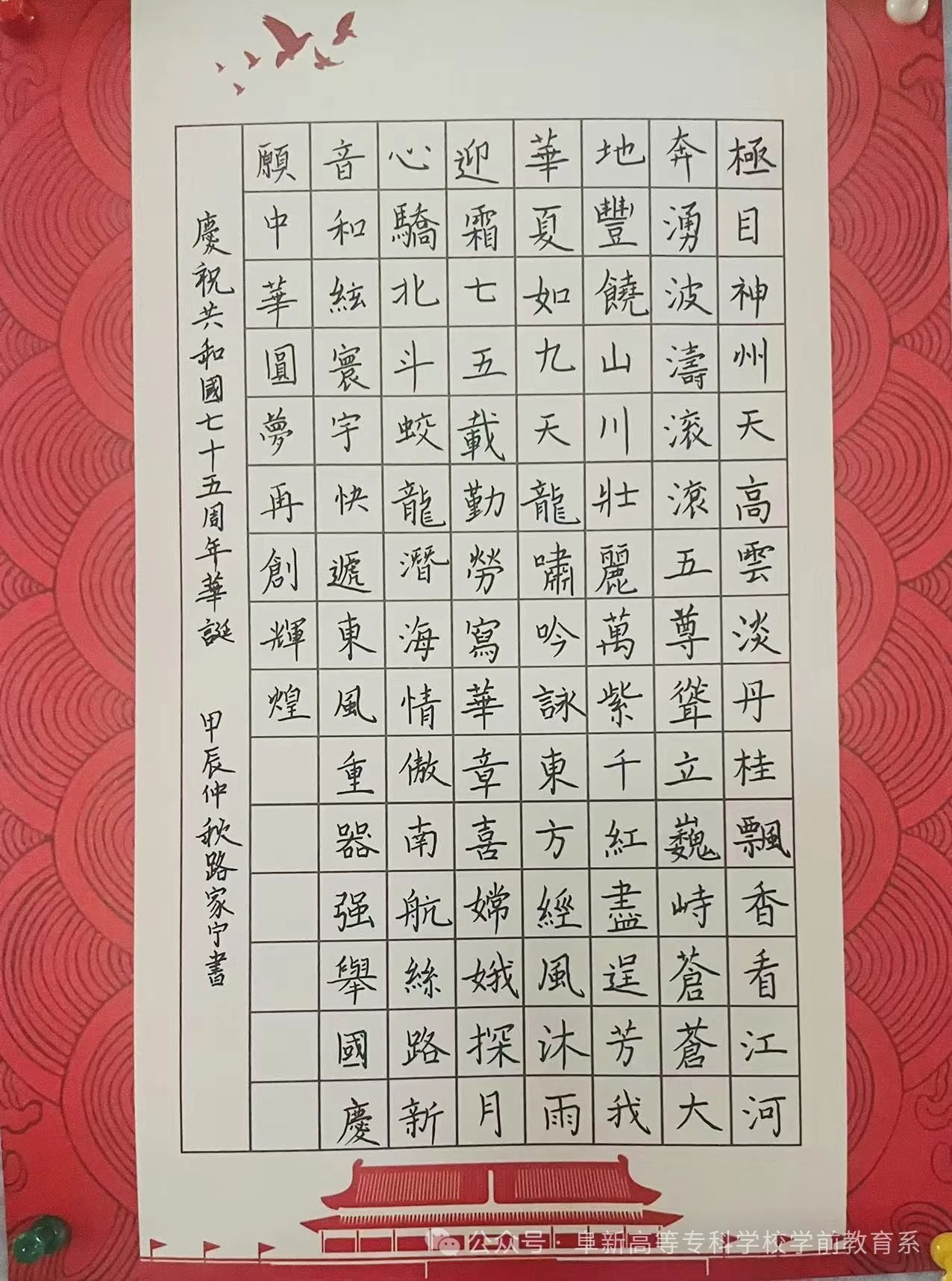 七十五載滄桑鑄就時(shí)代華章,五千年翰墨禮贊盛世中華。為慶祝中華人民共和國(guó)成立75周年,弘揚(yáng)愛(ài)國(guó)主義精神,傳承中華優(yōu)秀傳統(tǒng)文化,激發(fā)學(xué)子愛(ài)國(guó)熱情,凝聚強(qiáng)國(guó)奮進(jìn)力量,學(xué)前教育系學(xué)子們,以青春之名,用行動(dòng)獻(xiàn)禮盛世中華。