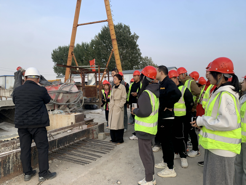 本次參觀學習由系副主任李苗苗帶隊,王思佳、郭天宇、王闊等老師參加。學習參觀的施工現(xiàn)場為公路公司農(nóng)村公路橋空心板預(yù)制場,大多數(shù)同學都是第一次近距離接觸施工現(xiàn)場,更是第一次戴起安全帽、穿上反光馬甲,初進工地都表現(xiàn)得很興奮。參觀過程中,公司副經(jīng)理、技術(shù)負責人姜海潮工程師給同學們詳細介紹了施工現(xiàn)場的設(shè)置,認識了施工現(xiàn)場的機械設(shè)備、建筑材料,講解了先張法預(yù)應(yīng)力空心板的施工工藝后,同學們也慢慢沉浸其中,對自己所學專業(yè)產(chǎn)生了濃厚的興趣,并向姜總工程師提出一個個自己疑惑的問題,現(xiàn)場氛圍非常熱烈。
