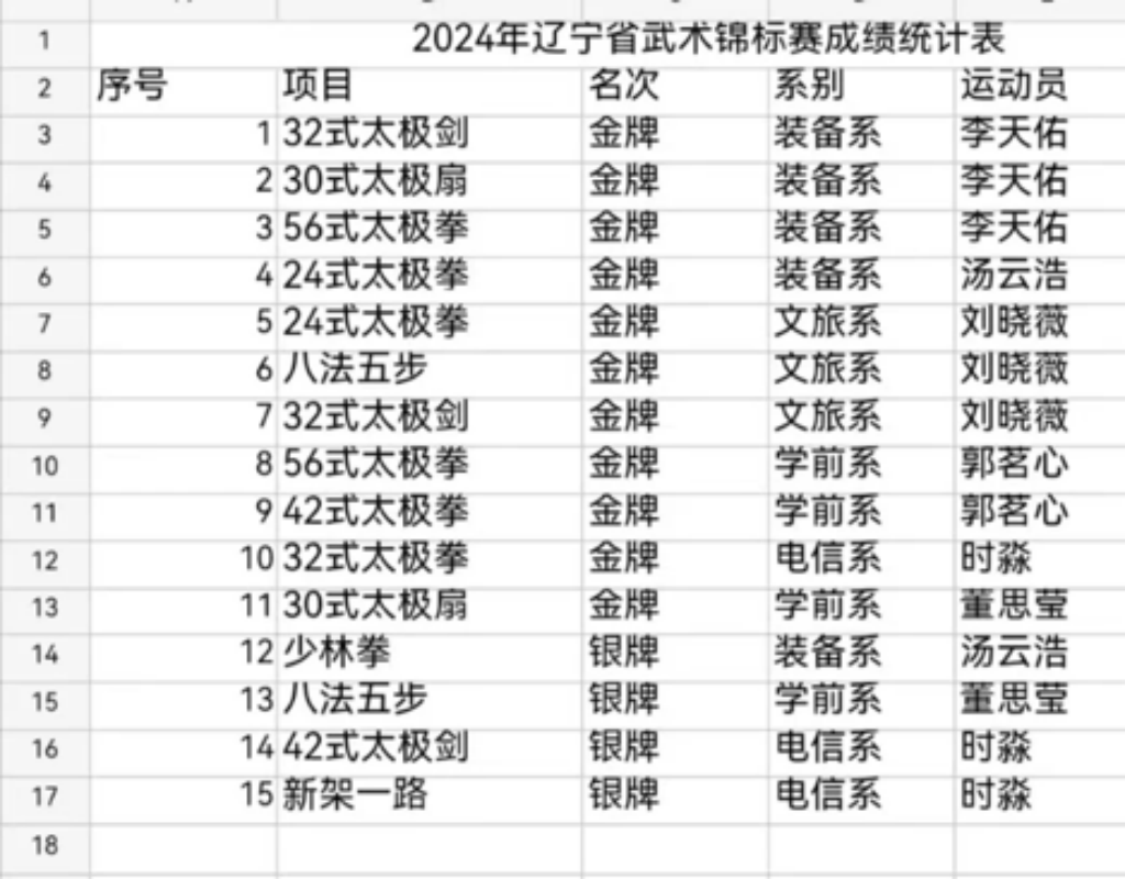 2024年11月15-17日,由遼寧省教育廳主辦、沈陽(yáng)理工大學(xué)承辦的2024年遼寧省大學(xué)生武術(shù)錦標(biāo)賽在沈陽(yáng)理工大學(xué)體育館圓滿落幕。來(lái)自全省30多所高校的200多名運(yùn)動(dòng)員參與角逐。本次賽事設(shè)本科院校組、高職高專組和體育院系組三個(gè)組別近40個(gè)項(xiàng)目,我校派出由體育教學(xué)部主任周海瑞擔(dān)任領(lǐng)隊(duì),包麗英、劉洋兩名教練員和4名女隊(duì)員、2名男隊(duì)員組成的代表隊(duì)參加了其中18項(xiàng)比賽。