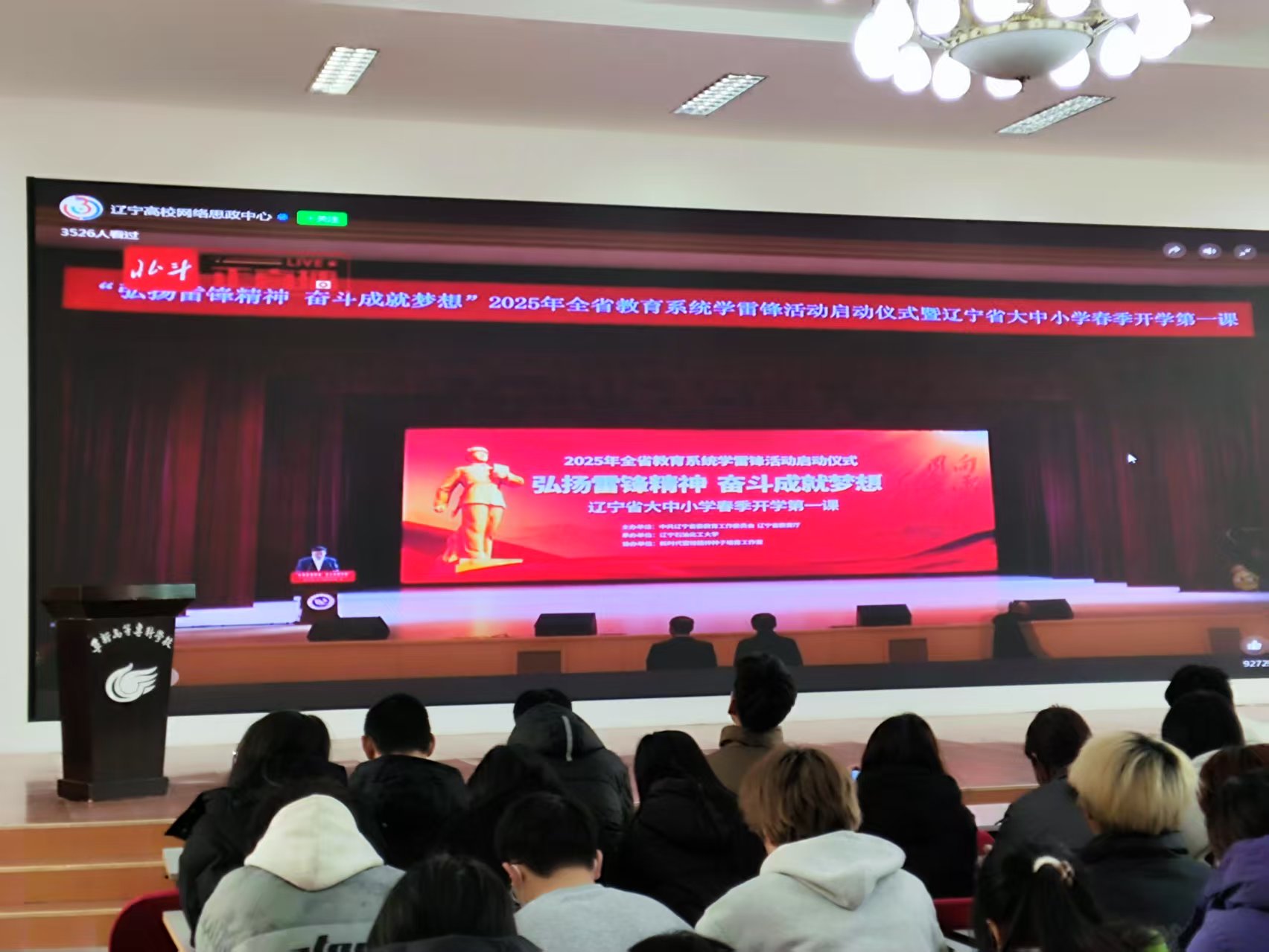 3月4日下午,組織全體學(xué)生收看了由省委教育工委、省教育廳主辦的2025年遼寧省大中小學(xué)"弘揚(yáng)雷鋒精神,奮斗成就夢(mèng)想”開學(xué)第一課暨全省教育系統(tǒng)學(xué)雷鋒活動(dòng)啟動(dòng)儀式。本次活動(dòng)利用線上線下相結(jié)合的方式,主會(huì)場(chǎng)在學(xué)校尚學(xué)樓五樓報(bào)告廳舉行,500名學(xué)生代表集中觀看,大約5000名學(xué)生同時(shí)在線上收聽收看。