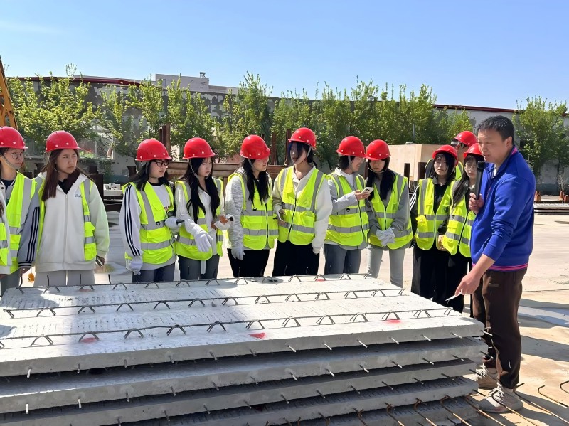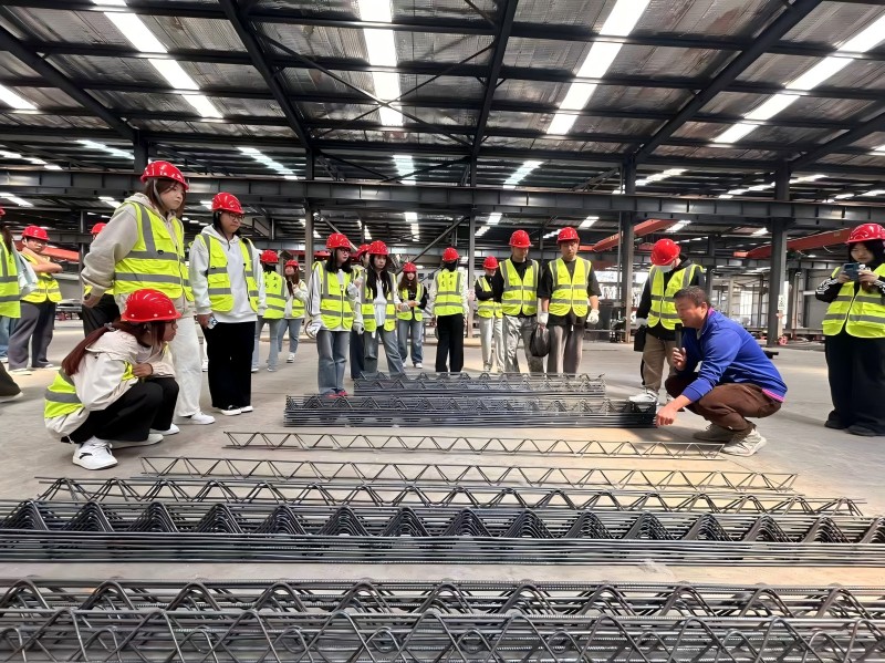實(shí)踐課程中,在企業(yè)導(dǎo)師高磊工程師的引導(dǎo)下,學(xué)生們沿著"認(rèn)知-體驗(yàn)-思考"的學(xué)習(xí)路徑深度參與此次生產(chǎn)實(shí)踐。先后參觀了構(gòu)件展示區(qū)、智能化生產(chǎn)車間和成品堆放養(yǎng)護(hù)區(qū)。通過現(xiàn)場學(xué)習(xí)和講解,深入學(xué)習(xí)了各種構(gòu)件的節(jié)點(diǎn)構(gòu)造,看到了桁架鋼筋自動化生產(chǎn)線、龍門吊與布料機(jī)的精準(zhǔn)協(xié)同工作,讓課本中學(xué)習(xí)的知識具象化為一幅工業(yè)化生產(chǎn)場景。